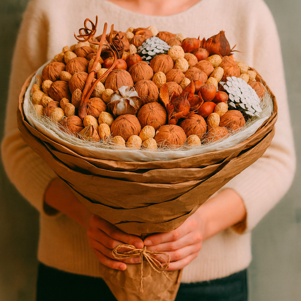 Грецкие орехи, арахис, миндаль и фундук создают изысканную композицию, дополненную хлопком и декоративными ветками. Букет оформлен в натуральную крафт-бумагу, подчеркивающую его природную красоту. Возможны альтернативы упаковки: матовая плёнка или декоративная сетка. Прекрасный выбор для коллеги на корпоративное мероприятие или для любимой на годовщину.