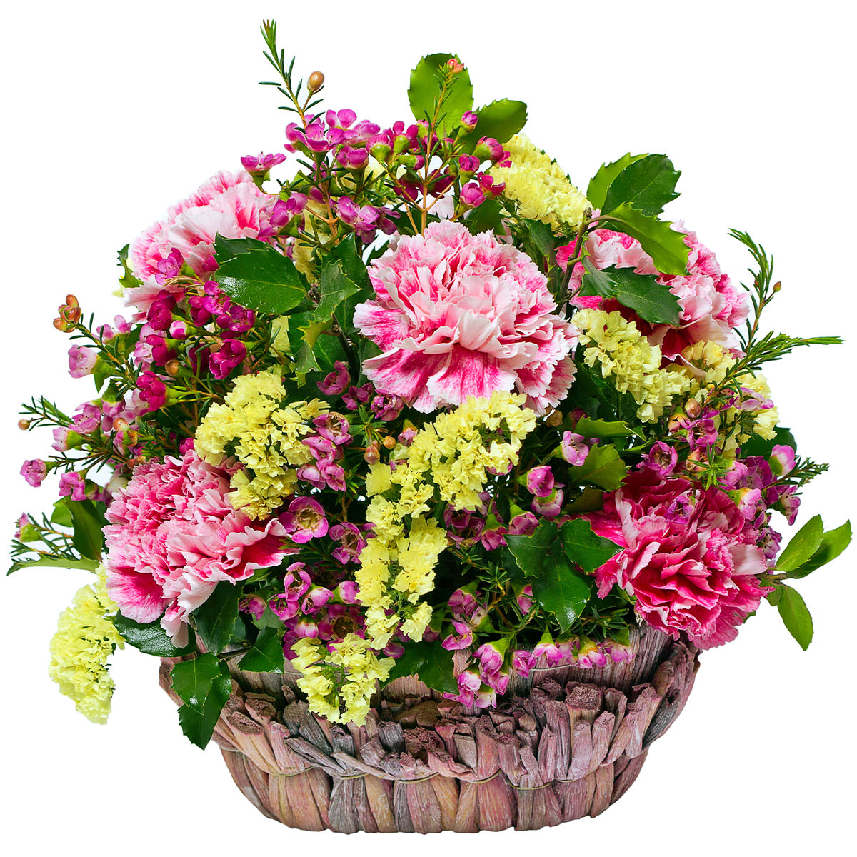 Пион кэнди страйп, ваксфлауэр и статица желтая создают яркую и нежную композицию в плетёной корзине. Корзина из лозы придаёт естественность и шарм. Альтернативные варианты оформления: корзина из ротанга или с тканевой отделкой. Прекрасный подарок для мамы на день рождения или юбилей.