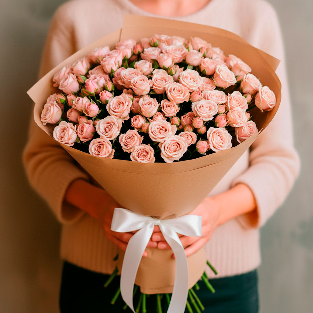 Кремовые кустовые розы создают нежное и романтичное настроение. Букет оформлен в крафт-бумагу и перевязан атласной лентой, что придаёт ему элегантность. Альтернативные варианты упаковки: матовая плёнка или декоративная сетка. Прекрасный выбор для подарка на годовщину или для любимой.