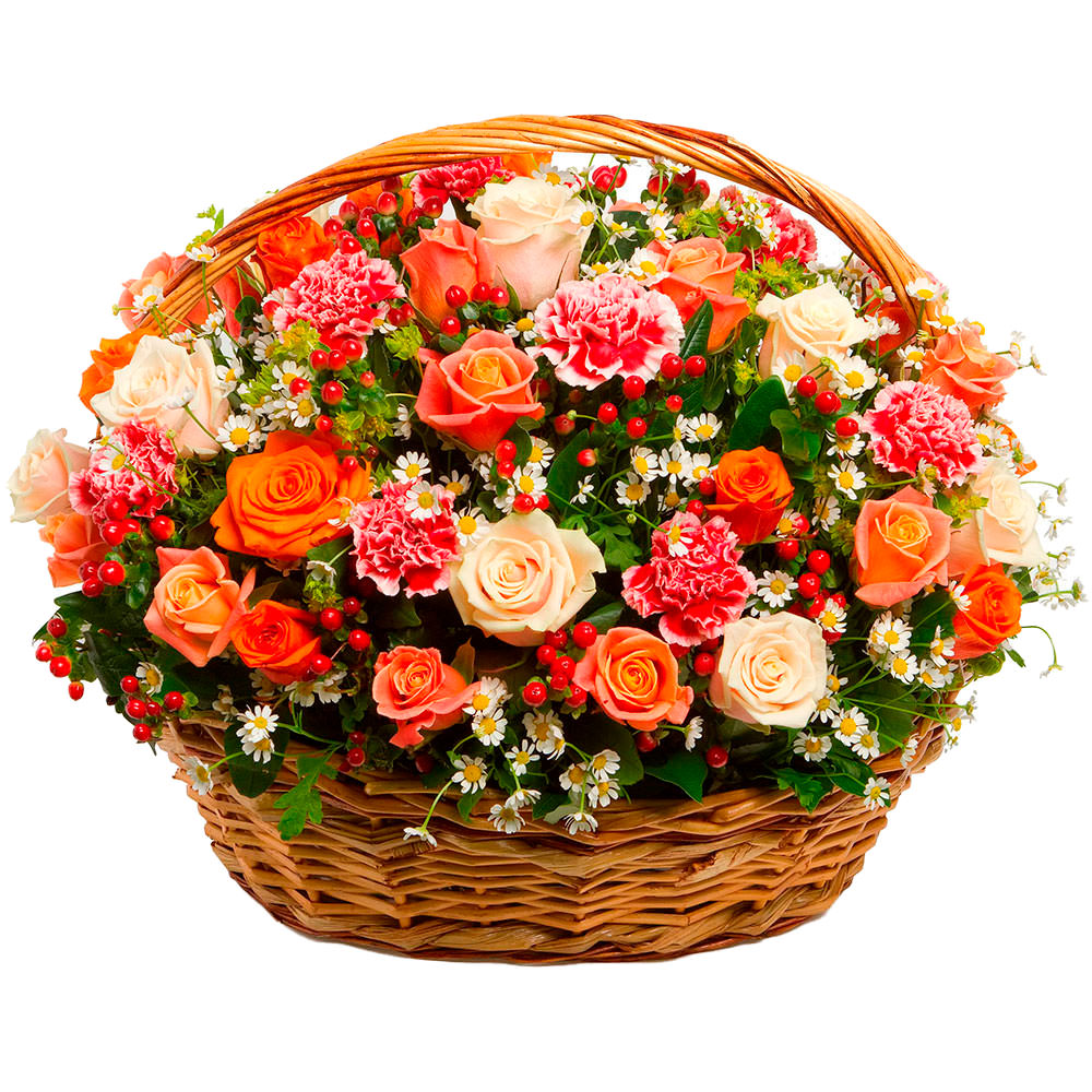 Великолепная композиция из кремовых и оранжевых роз, розовых гвоздик, гиперикума и танацетума создаёт атмосферу нежности и радости. Цветы аккуратно расположены в плетёной корзине с оазисом, что обеспечивает их свежесть. Альтернативно можно оформить в корзине из лозы или ротанга. Прекрасный подарок для любимой на годовщину или день рождения.