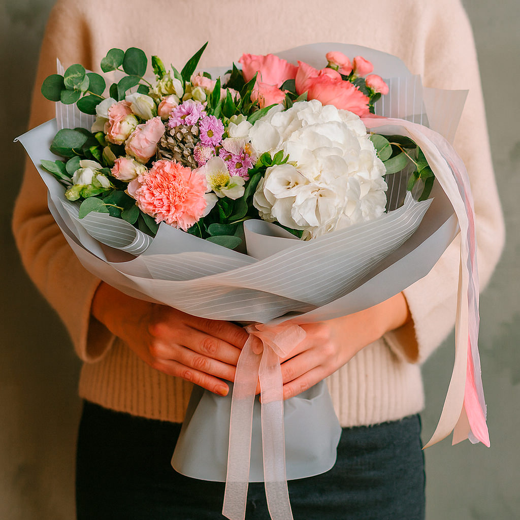 Белоснежная гортензия и альстромерия гармонично сочетаются с розовыми гвоздиками и кустовыми розами, создавая нежный и романтичный образ. Букет оформлен в матовой плёнке и перевязан атласной лентой, что придаёт ему изысканность. Возможны варианты упаковки с крафт-бумагой или декоративной сеткой. Прекрасный подарок для любимой на годовщину или день рождения.