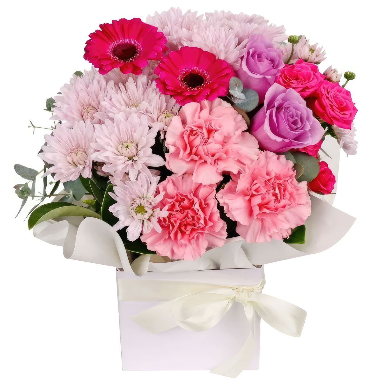 Розовые герберы, сиреневые одноголовые розы, кустовые розовые розы и хризантемы создают нежное сочетание в этой композиции. Гвоздики добавляют яркости и объема. Упаковано в элегантную квадратную коробку с белой лентой. Возможны варианты оформления в бархатной или атласной коробке. Прекрасный подарок для любимой на день рождения или годовщину.