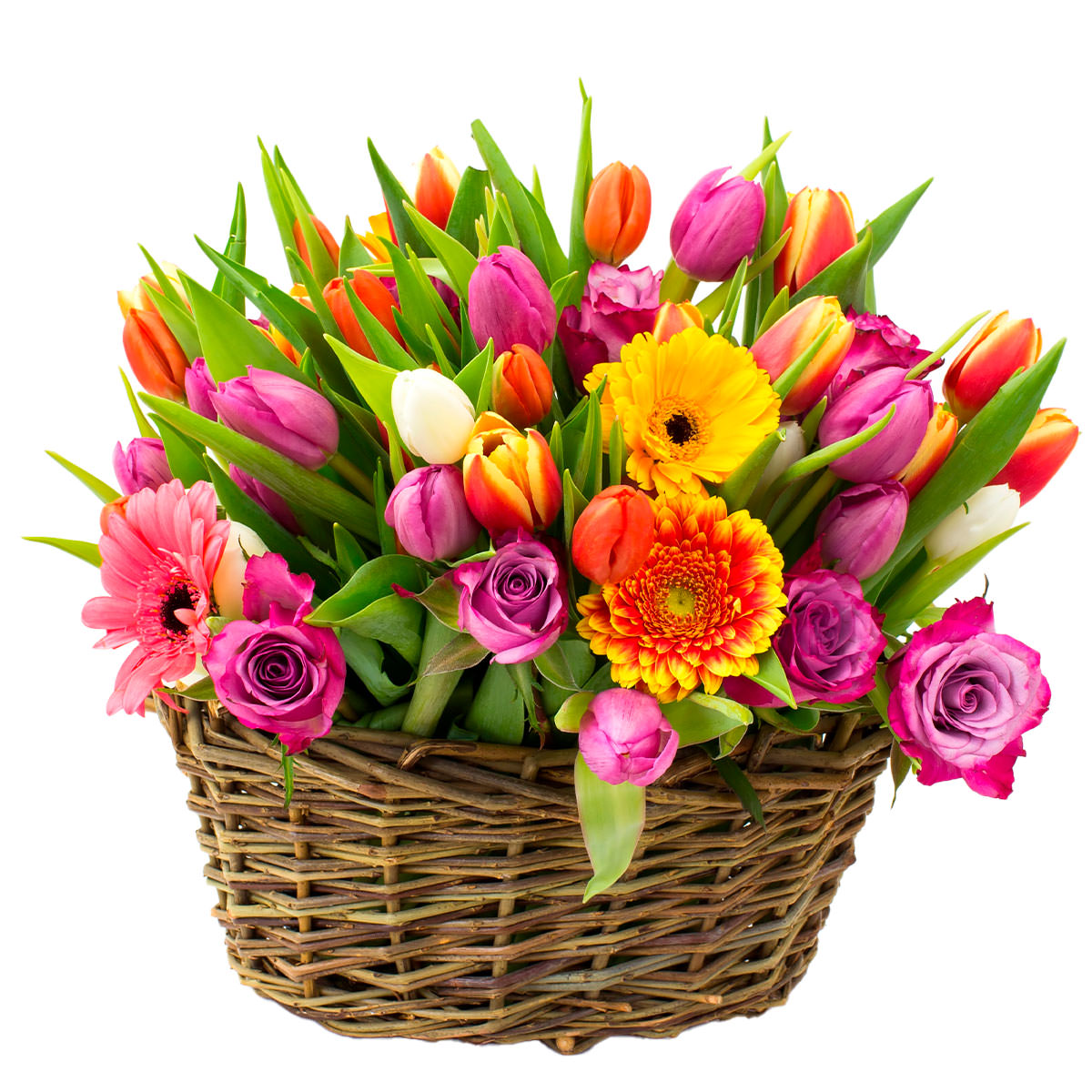 Яркая цветочная композиция с жёлтыми и оранжевыми герберами, сиреневыми розами и разноцветными тюльпанами. Цветы аккуратно размещены в плетёной корзине, создавая атмосферу весеннего настроения. Возможны альтернативы оформления: корзина из лозы или ротанга. Прекрасный подарок для любимой на 8 марта или День матери.